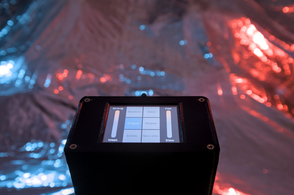 The audience can interact with the installation by choosing different breathing patterns with the remote control. They can also influence the speed and intensity of the movements by activating the sensors on each side of the remote control with their hands.