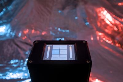 - The remote has a touch screen and two ultrasonic sensors allowing the audience to interact with the installation: