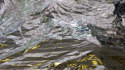 - On top of the bags are four connected Mylar emergency foil blankets, each measuring 160 cm by 210 cm. The foils are pushed up and down by the inflate-deflate cycles of the trash bags. The maximum height is about 50 cm.